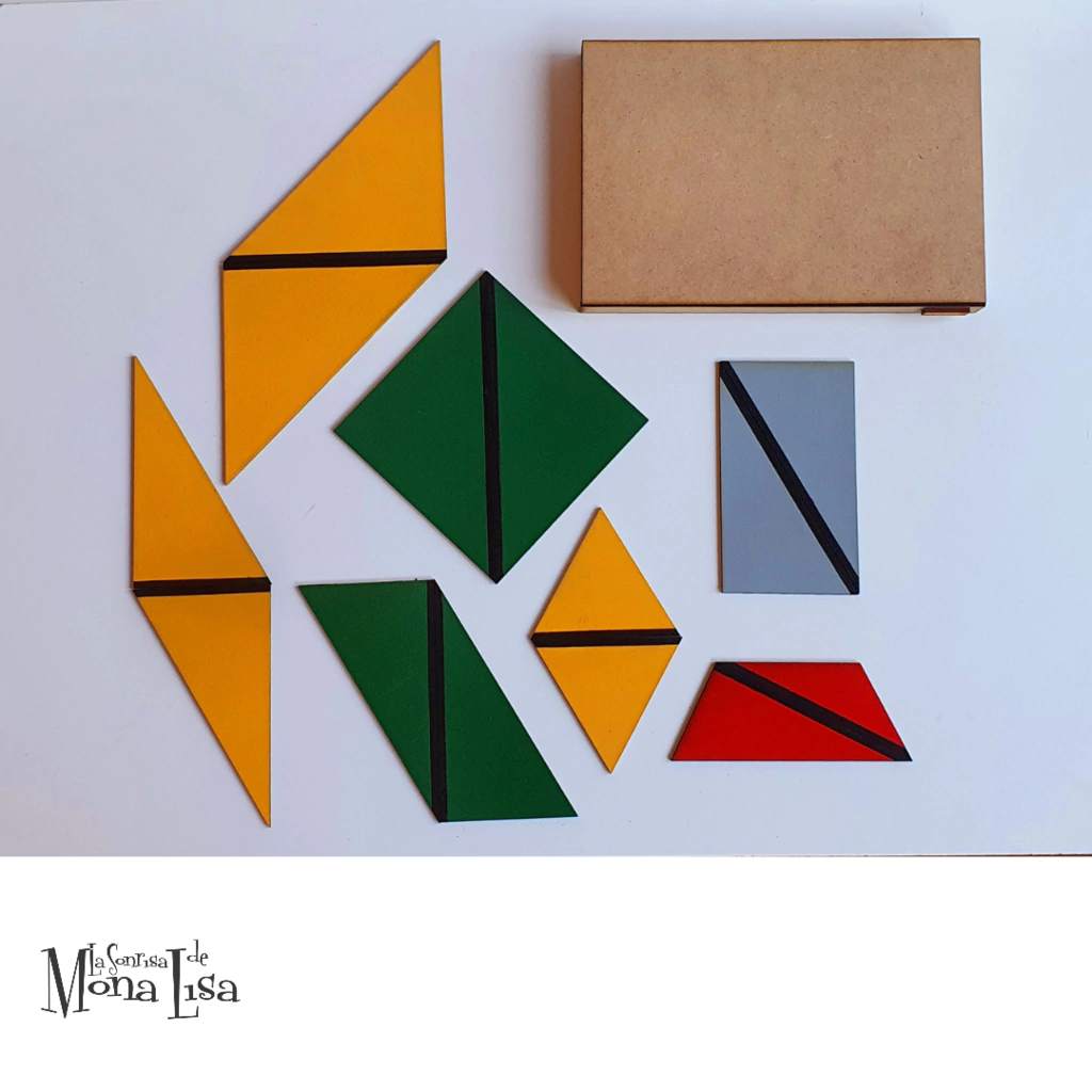 Incluye triángulos de diferentes tamaños, colores y formas para trabajar la geometría.